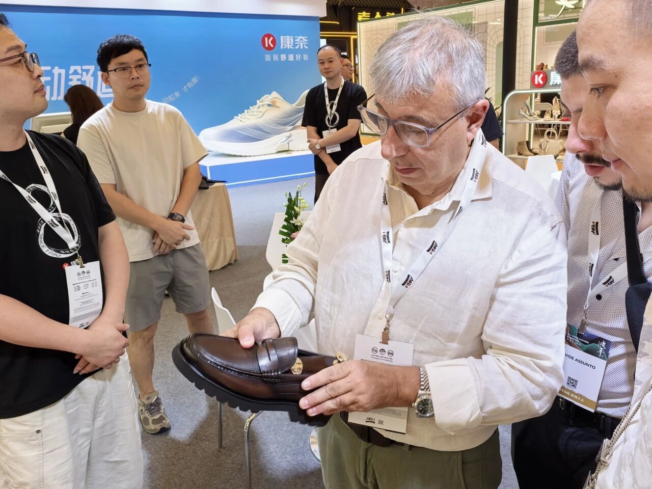 康奈舒适时尚科技体验馆内,国内外采购商和顾客络绎不绝,他们或驻足体验,或细致咨询产品功能,亦或在体验舒适定制;部分国际采购商还就合作事宜与工作人员深入沟通,现场互动热度持续攀升。特别值得一提的是,澳大利亚客户Urban穿着康奈集团出口的鞋子到展厅,对康奈鞋赞不绝口并洽谈合作。